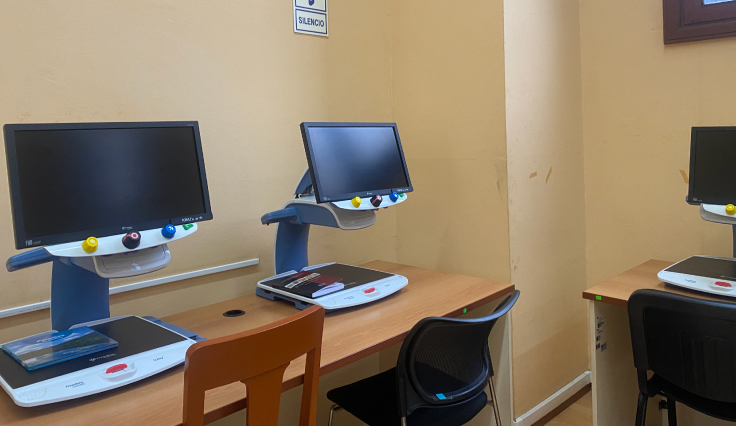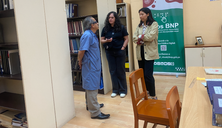 Otro interesante espacio es la Sala para personas con discapacidad visual «Delfina Otero Villarán» donde reciben personas con ceguera o baja visión, está dotada con lupas electrónicas, escáner de textos e impresoras para braille, lámparas y computadoras especiales, libros en Braille,  además puedes traer el libro que necesites y lo convierten en sistema braille, material que puede ser enviado a cualquier parte del país de manera gratuita. Su creación también guarda una increíble historia vinculada con el señor Rigoberto Camargo quien tiene 34 años laborando en la BNP, se inició como vigilante pero en la época del terrorismo la explosión de un coche bomba lo dejaría ciego, a sus 33 años. Luego de su rehabilitación, el señor Camargo volvió a su lugar de trabajo y realizó diversas actividades en la encuadernación de libros o en la central telefónica.