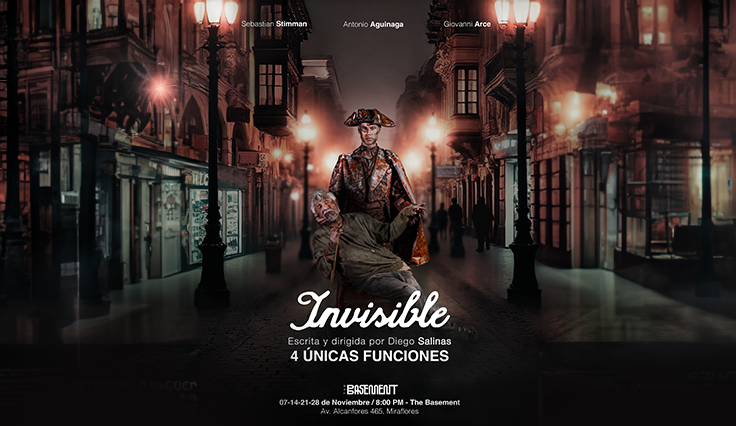 Protagonizada por Sebastián Stimman, Antonio Aguinaga y Giovanni Arce, “Invisible” es una historia entrañable y mágica que aborda temas como la soledad, la esperanza y la necesidad de ser visto. La obra pone en primer plano a los “invisibles” de nuestra sociedad, ya sea un mendigo en la calle, o aquellas personas cercanas – familiares, amigos, o incluso nosotros mismos – que, en ocasiones, se sienten ignoradas o desdibujadas por el resto.