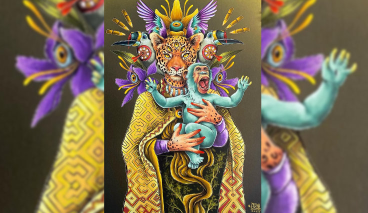 «Hambre y miedo» es una ilustración que le llevó al artista más de 2 meses terminarla por la complejidad de su concepto. Invita a la reflexión acerca de la lucha que vive la selva y la dualidad de su estética frente al dolor constante por sobrevivir. El grito del primate es sin duda un llamado a tomar conciencia por lo que sucede en nuestro ambiente. Zelvauno es un reconocido ilustrador y muralista que ha profundizado su mirada en la Amazonía y es organizador del Festival Amazonarte, espacio que difunde y cuida el patrimonio cultural de la Amazonía peruana.