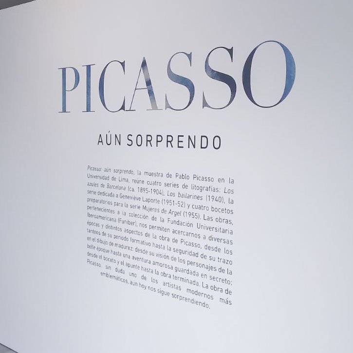 Gracias al convenio de cooperación interinstitucional entre la Universidad de Lima y la Fundación Universitaria Iberoamericana (FUNIBER), se ha podido exhibir esta interesante muestra itinerante que nos permite ahondar más en la producción artística de Picasso. En las series expuestas podemos apreciar sus inicios y también sus últimos años. En ellas se logra apreciar las diferentes influencias y técnicas empleadas. Asimismo, nos permite ahondar en detalles de su vida personal, sus intereses y sus reflexiones.