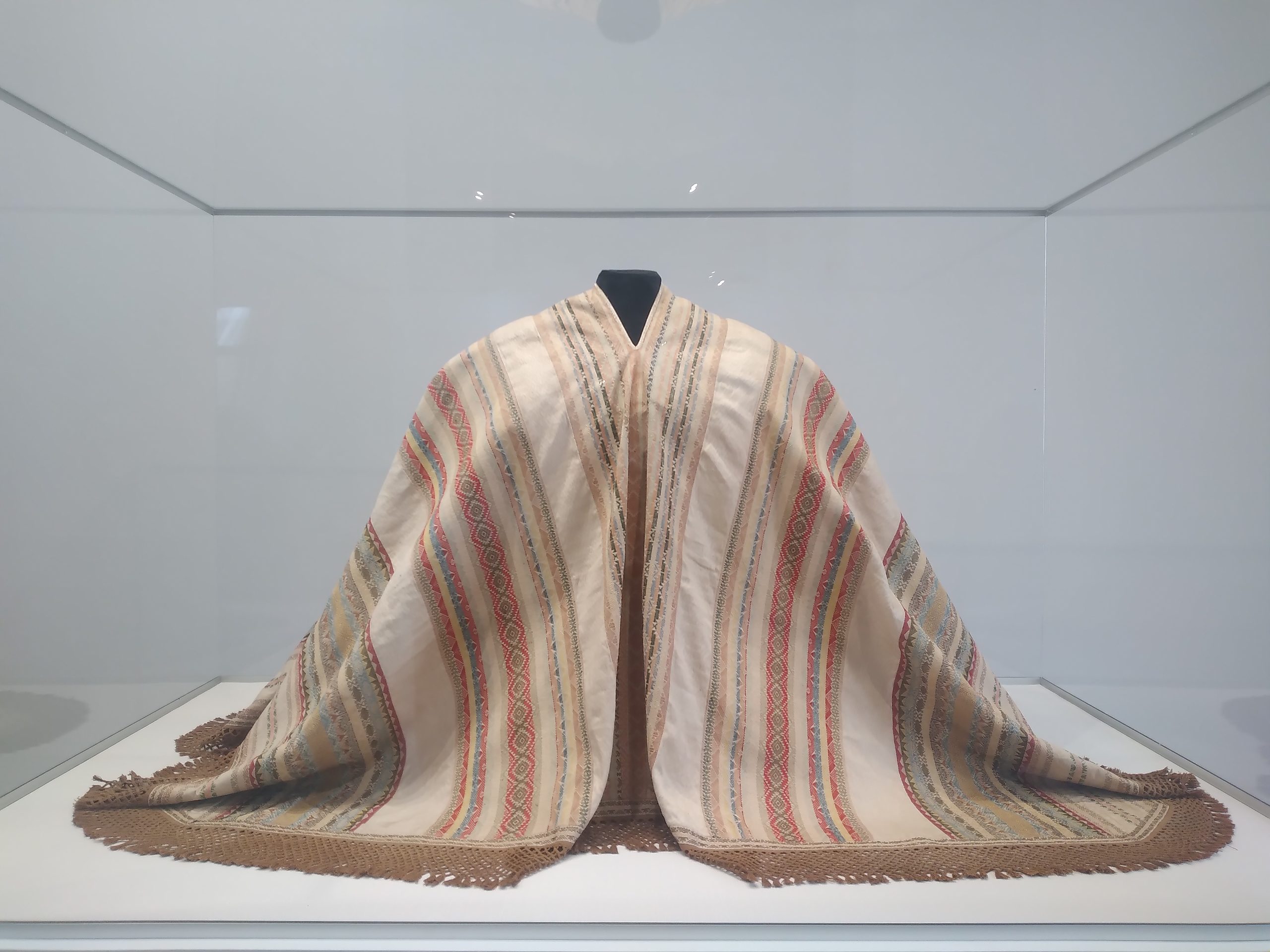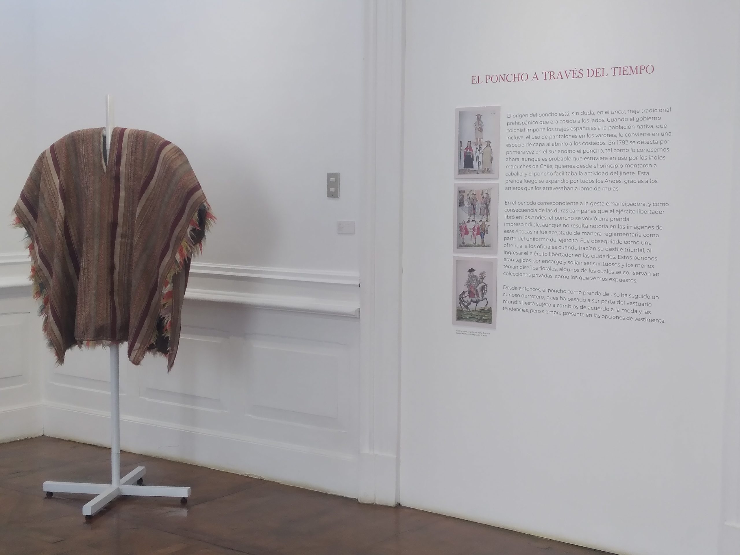 La muestra nos permite conocer la importancia que ha tenido el poncho en la historia. Nos precisan que en 1610 se prohibió el uso del traje prehispánico y se adoptó la moda campesina de España. No obstante, la necesidad de contar con un abrigo hizo que el uncu se abriera por los costados, transformándose en una especie de capa. Usada esencialmente por los indígenas, progresivamente fue adoptada por criollos y españoles.