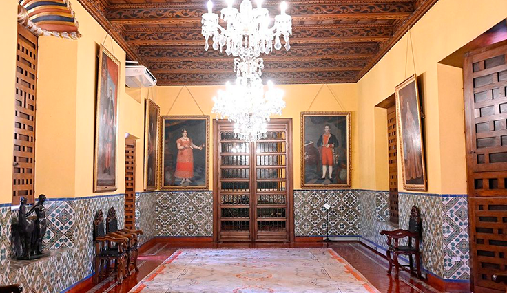 Dentro, los azulejos sevillanos decoran los muros con motivos que mezclan lo español y lo morisco, transportando a los visitantes al siglo XVIII. Además, se pueden observar los salones con muebles de estilos europeos como Luis XV y Neoclásico, junto a obras pictóricas de artistas reconocidos como José Gil de Castro.