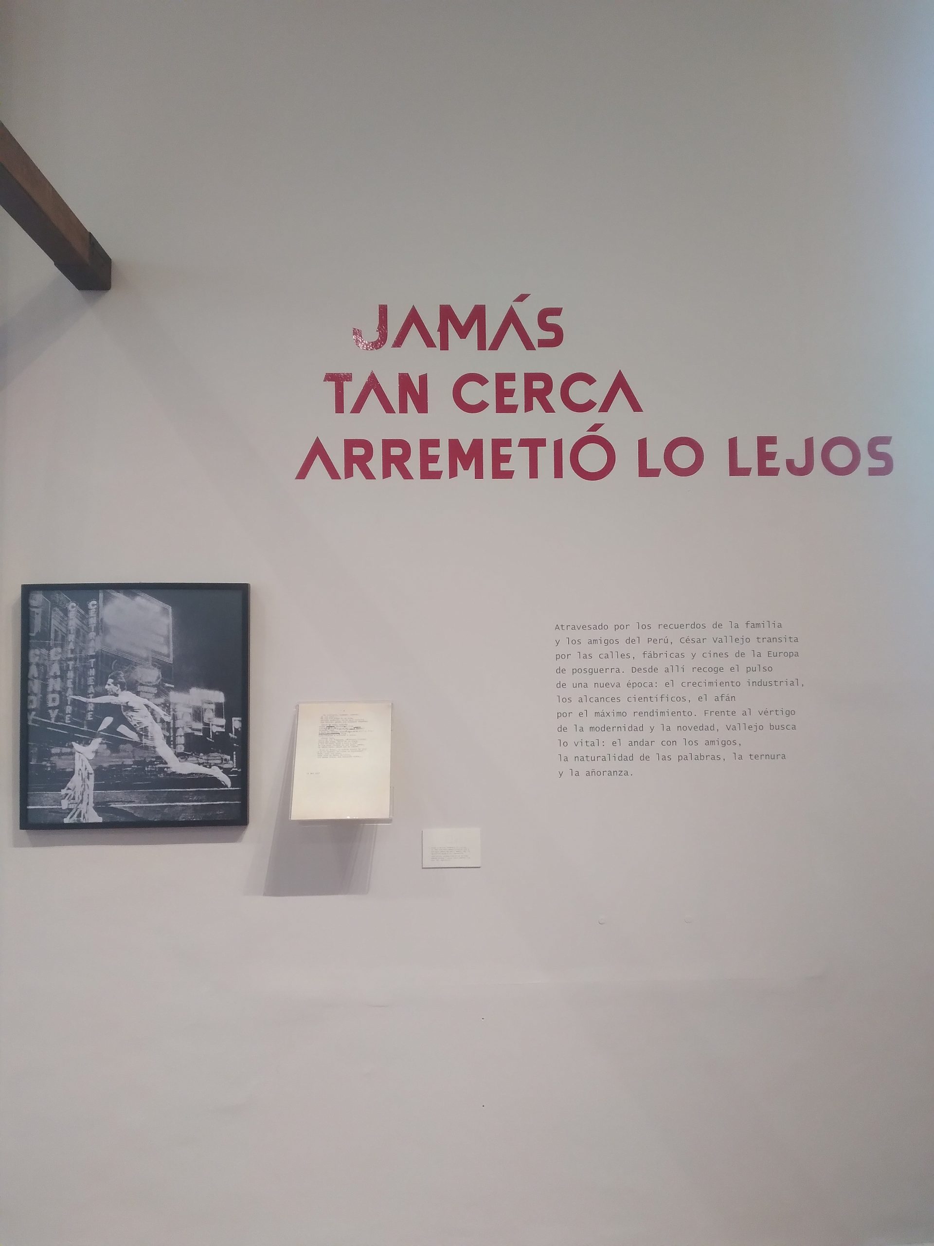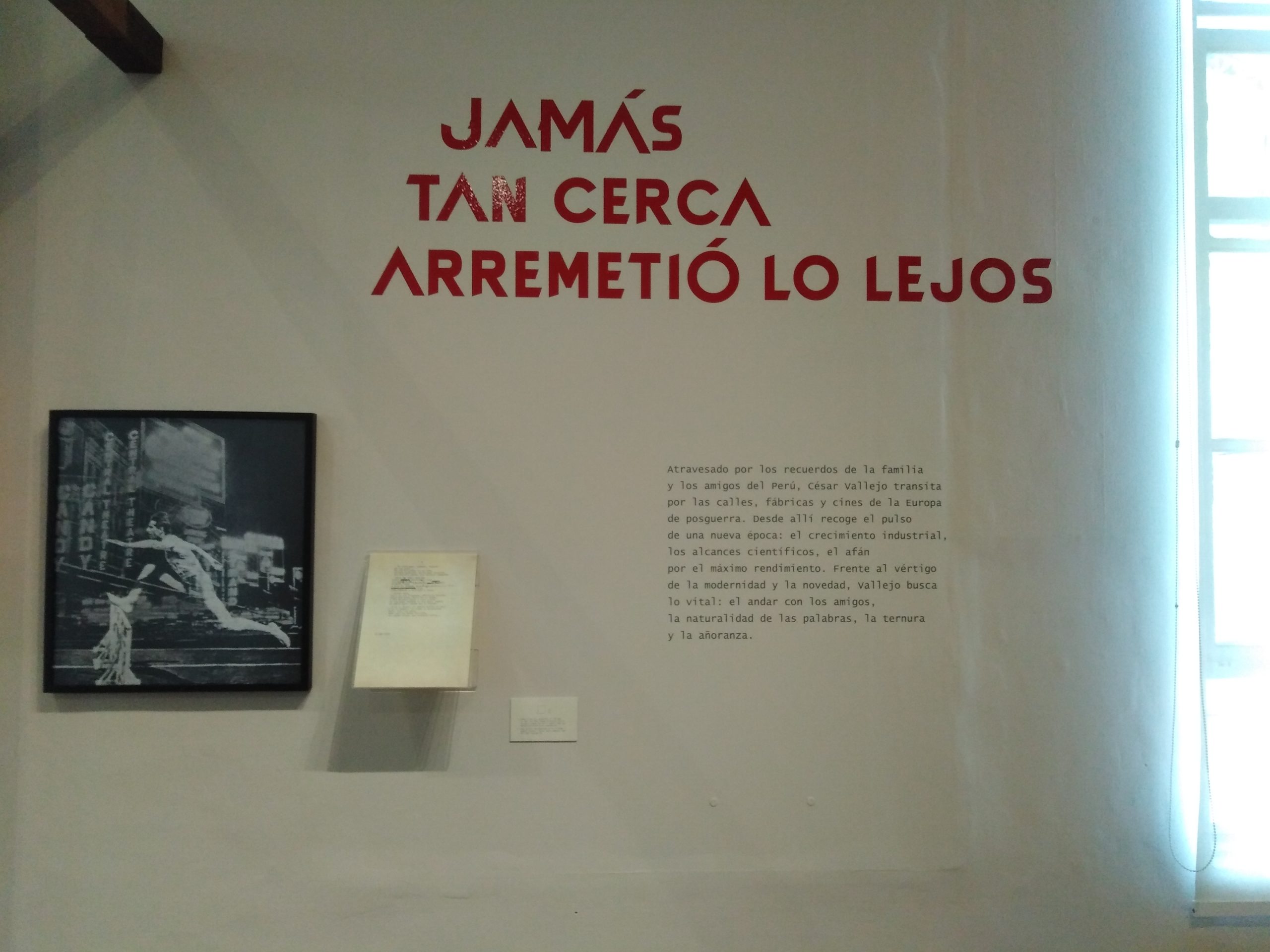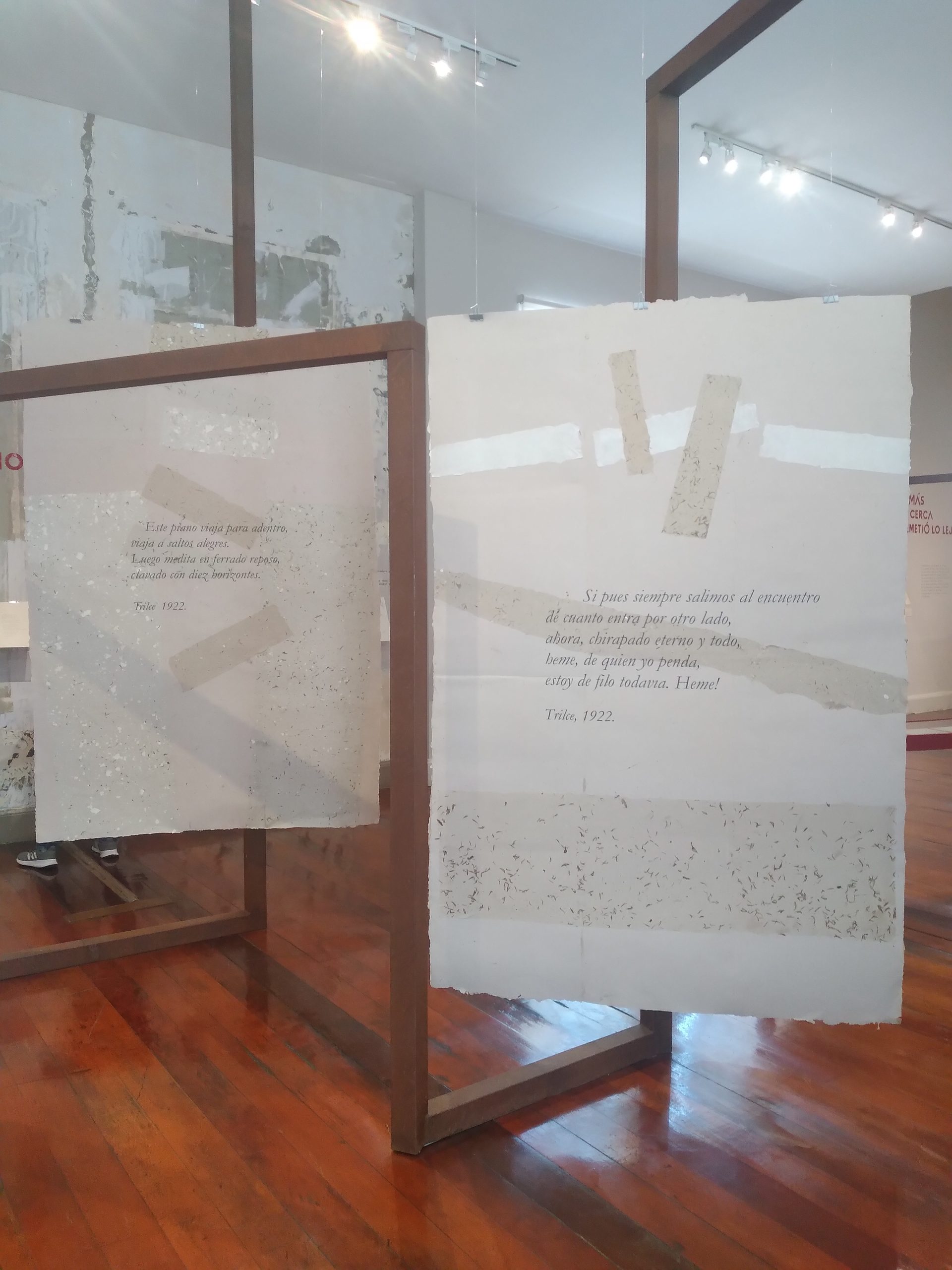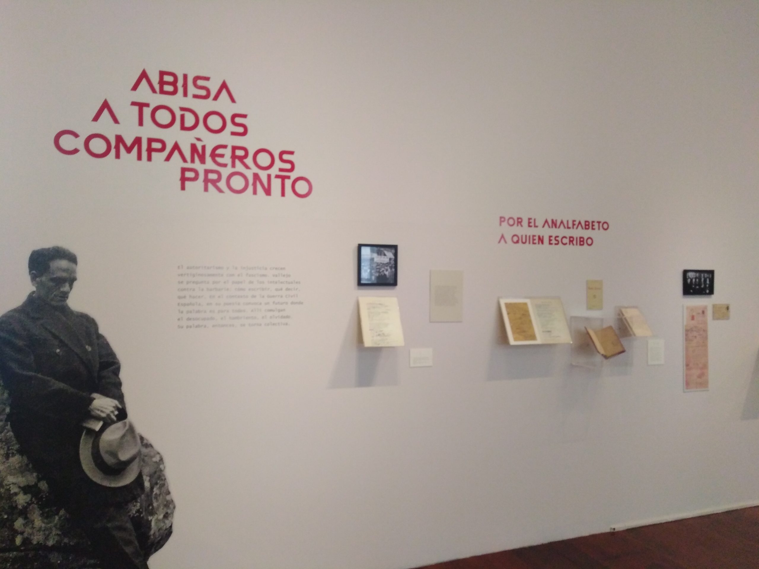 En la amplitud de recursos que encontramos en la exhibición podemos delinear los gustos e intereses de César Vallejo, el contexto histórico y social que vivió, su experiencia en la cárcel, en lugares que visitó y en personas con las que compartió. Todo ello en diálogo con sus escritos, muchos de los cuales están expuestos en grandes láminas de papel artesanal. Podemos advertir la importancia de su poemario «Trilce», del cual se conoce que empezó a circular en octubre de 1922. Constaba de 121 páginas de texto y XVI de prólogo, éste escrito por Antenor Orrego, gran amigo de Vallejo. En su portada se ubicaba un retrato a lápiz del poeta, realizado por Víctor Morey Peña. Fue impreso en los Talleres de la Penitenciaría de Lima y cada ejemplar tenía un valor de 3 soles.