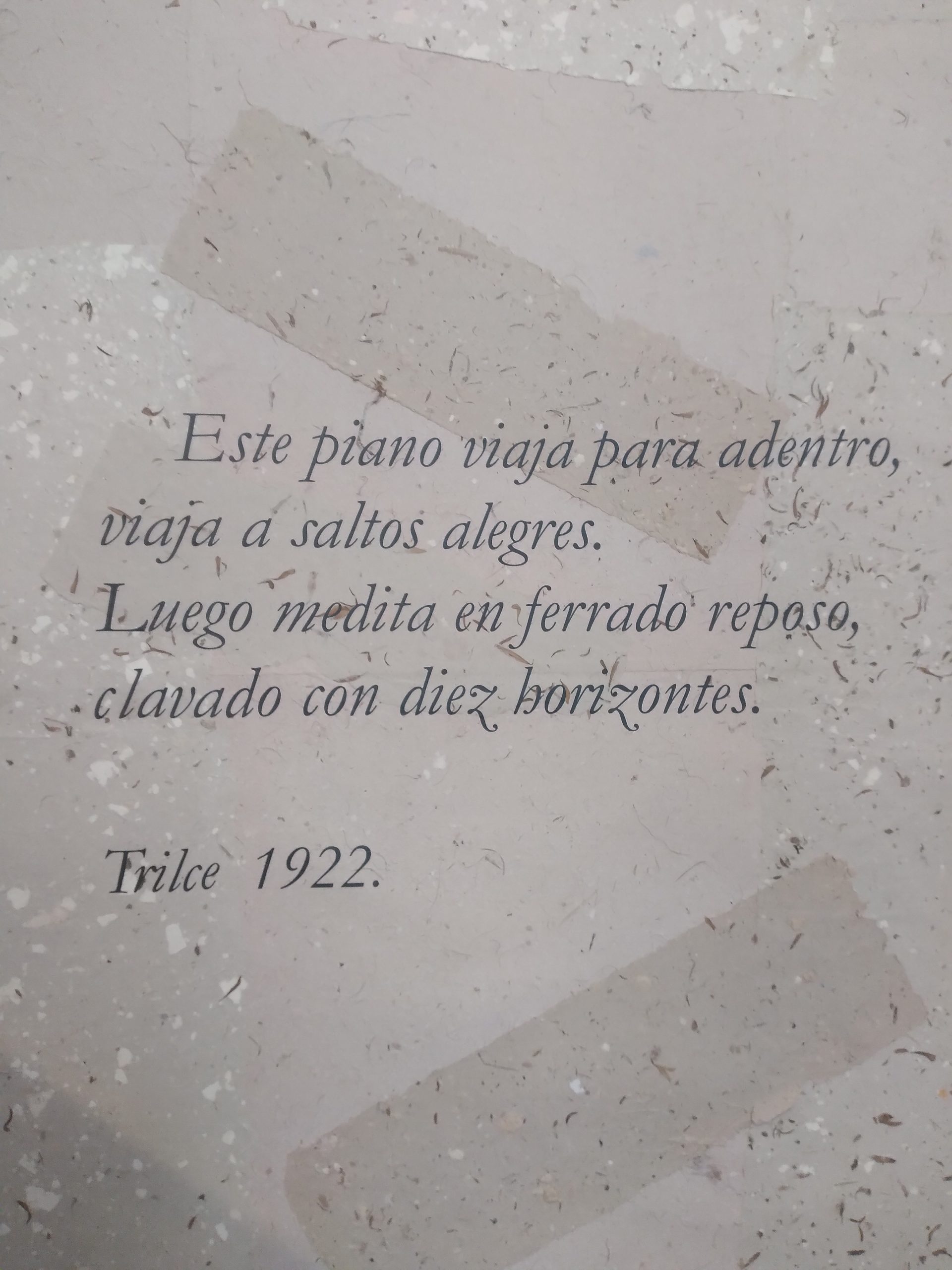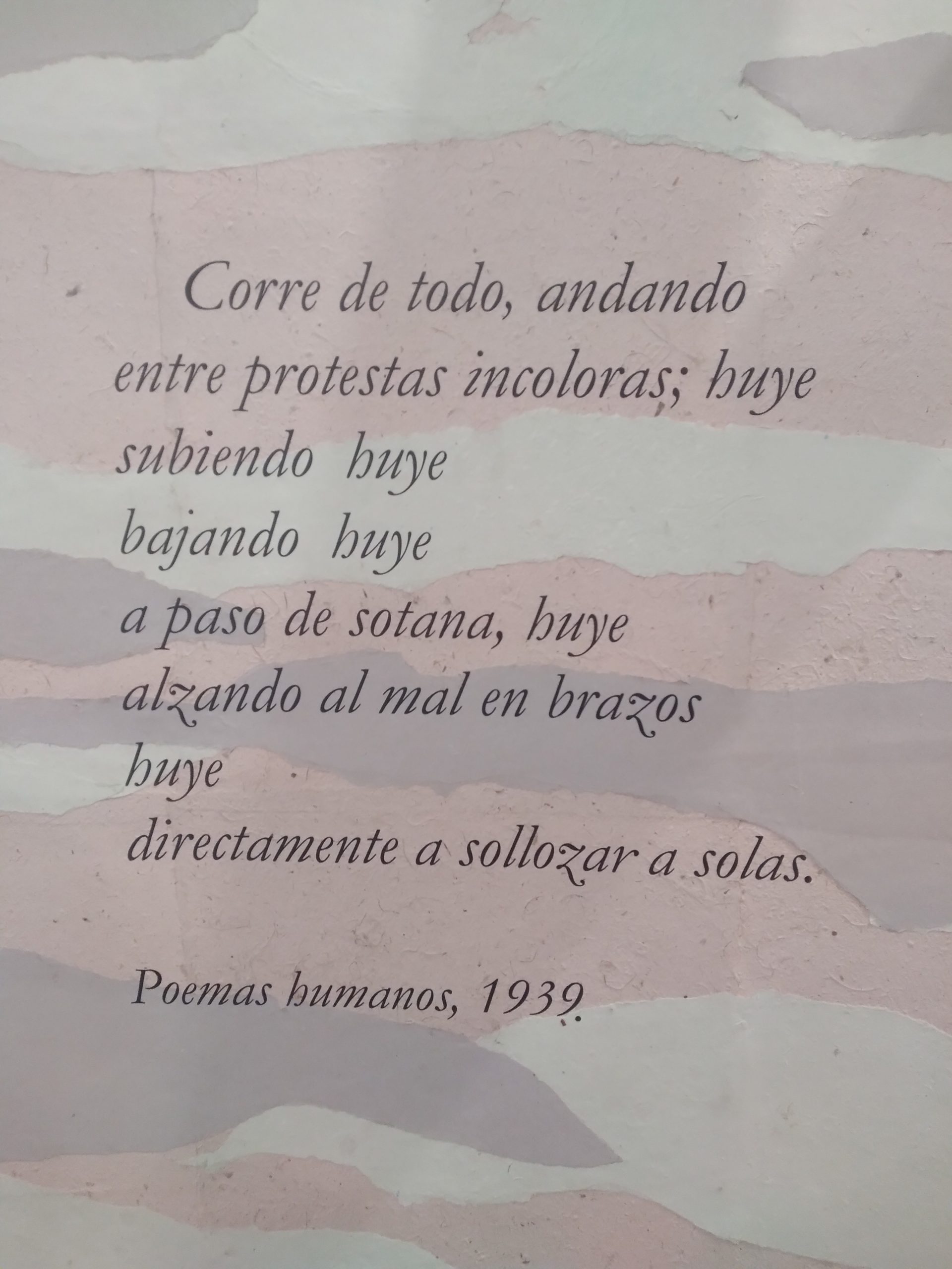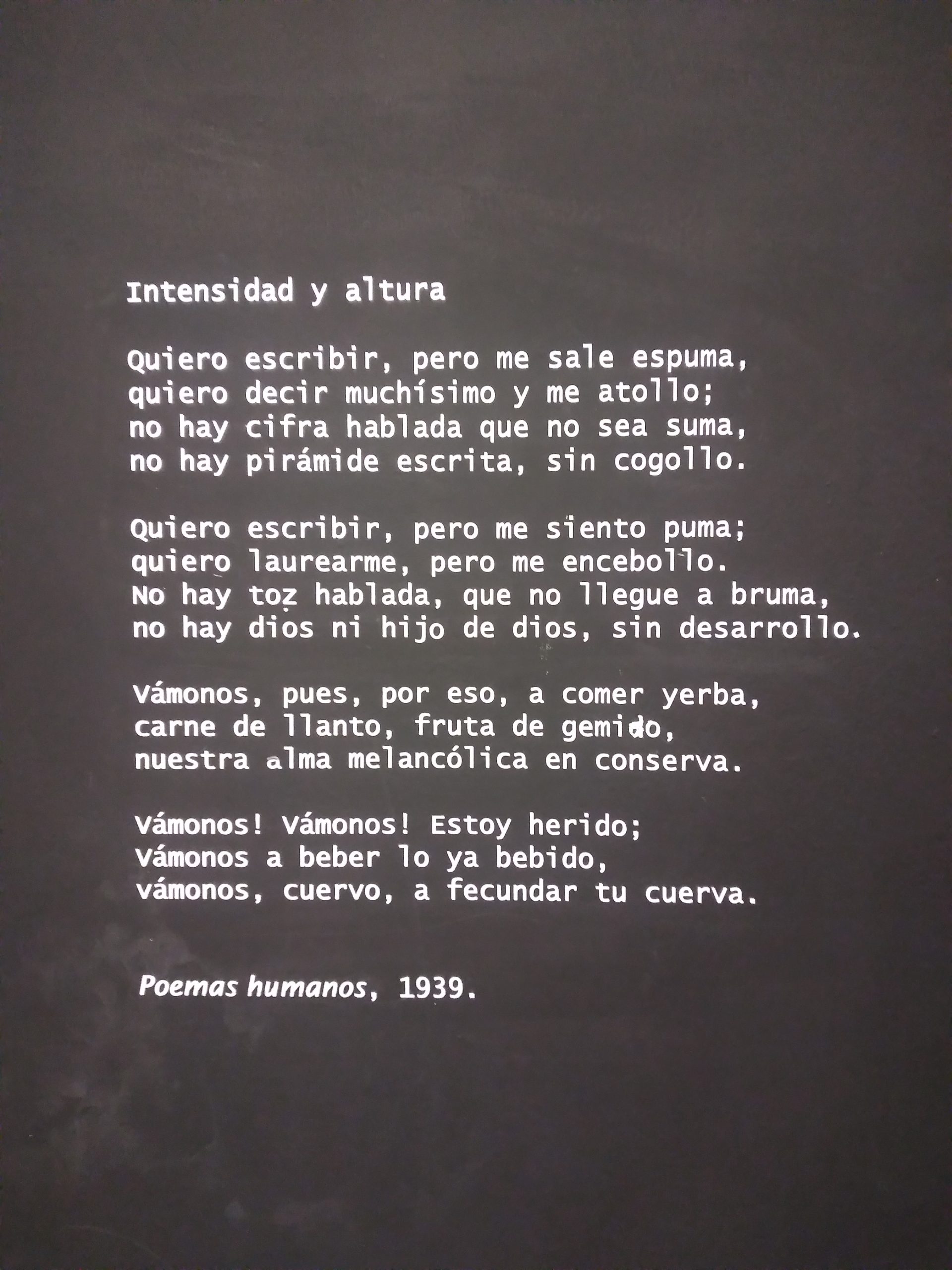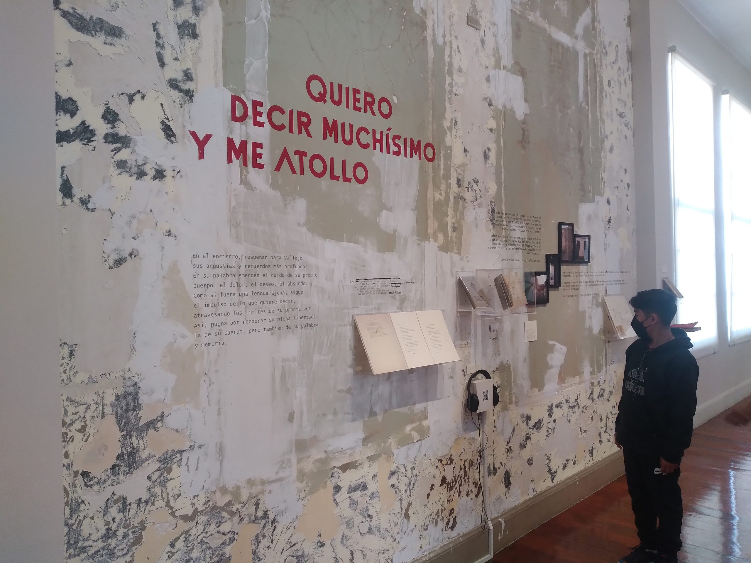 En la amplitud de recursos que encontramos en la exhibición podemos delinear los gustos e intereses de César Vallejo, el contexto histórico y social que vivió, su experiencia en la cárcel, en lugares que visitó y en personas con las que compartió. Todo ello en diálogo con sus escritos, muchos de los cuales están expuestos en grandes láminas de papel artesanal. Podemos advertir la importancia de su poemario «Trilce», del cual se conoce que empezó a circular en octubre de 1922. Constaba de 121 páginas de texto y XVI de prólogo, éste escrito por Antenor Orrego, gran amigo de Vallejo. En su portada se ubicaba un retrato a lápiz del poeta, realizado por Víctor Morey Peña. Fue impreso en los Talleres de la Penitenciaría de Lima y cada ejemplar tenía un valor de 3 soles.